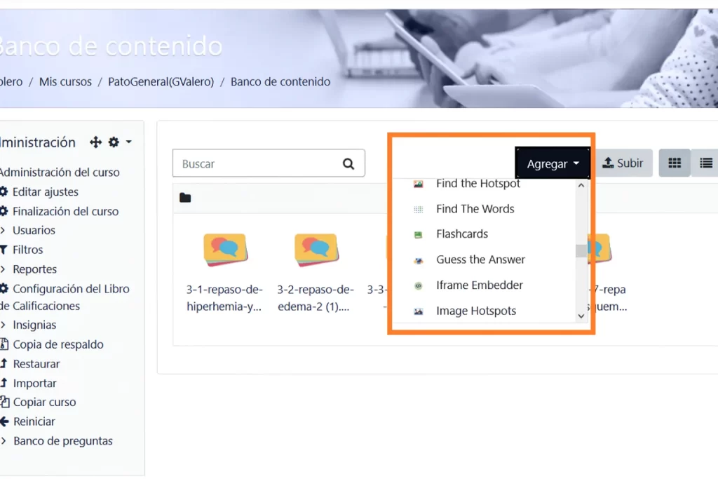 Lo más práctico es crearlo en el Banco de contenidos del curso. Desde ahí puedes organizar todos tus recursos interactivos H5P, reutilizarlos en varias aulas virtuales y actualizar una sola vez para que cambien en todos los sitios donde estén incrustados. Después, en el curso, solo añades una actividad H5P o lo insertas desde el editor de texto. Si lo creas suelto como actividad, será más difícil reutilizarlo en otros cursos.